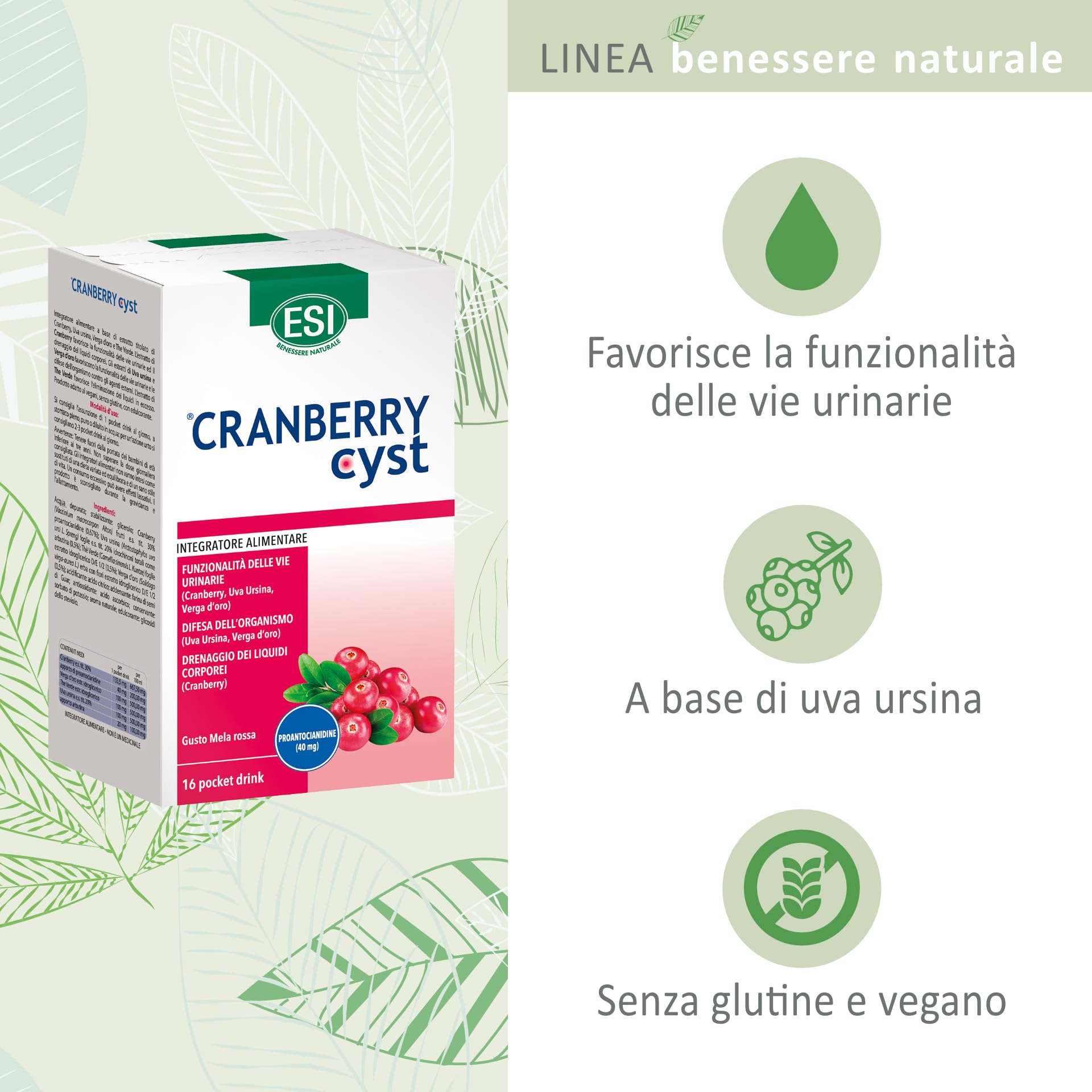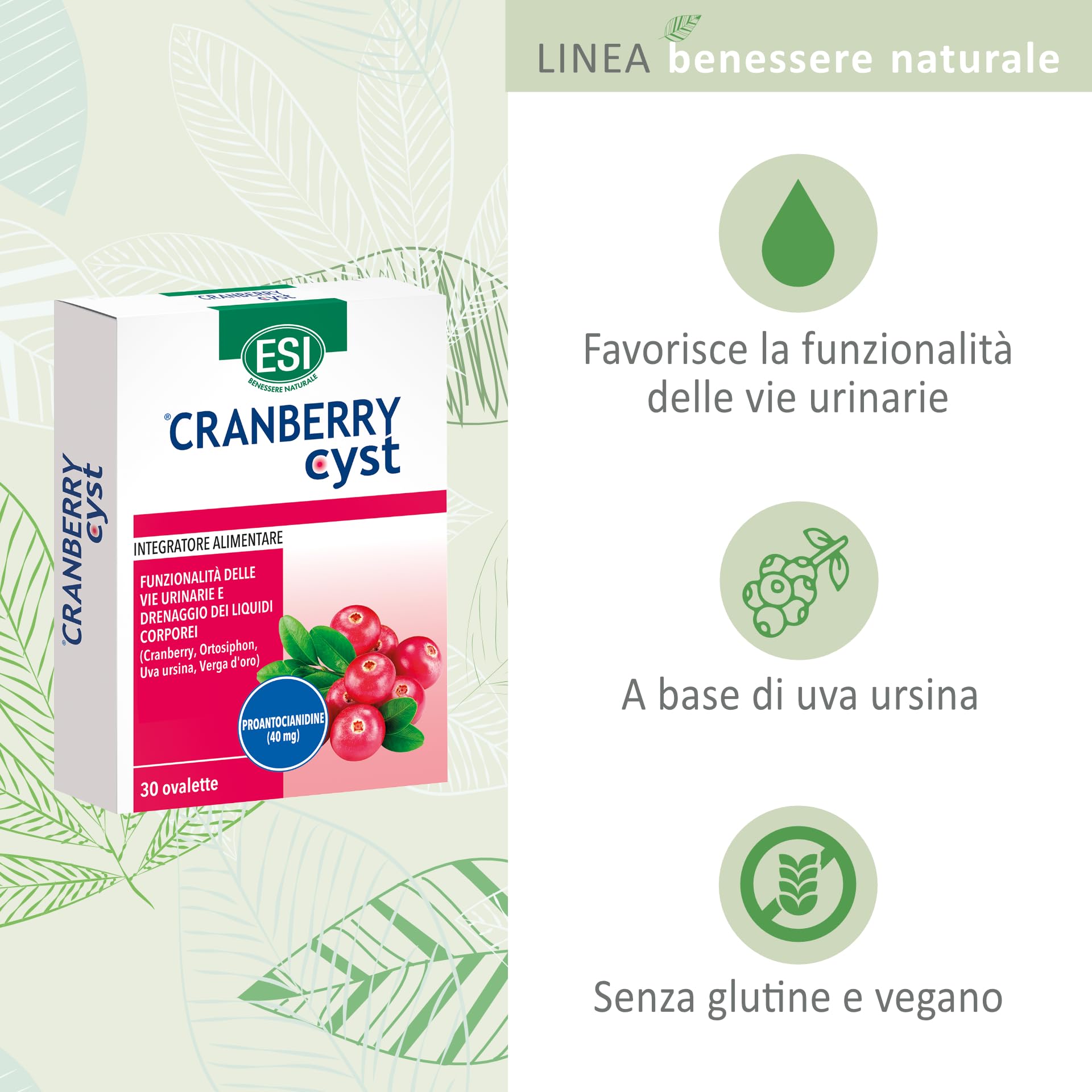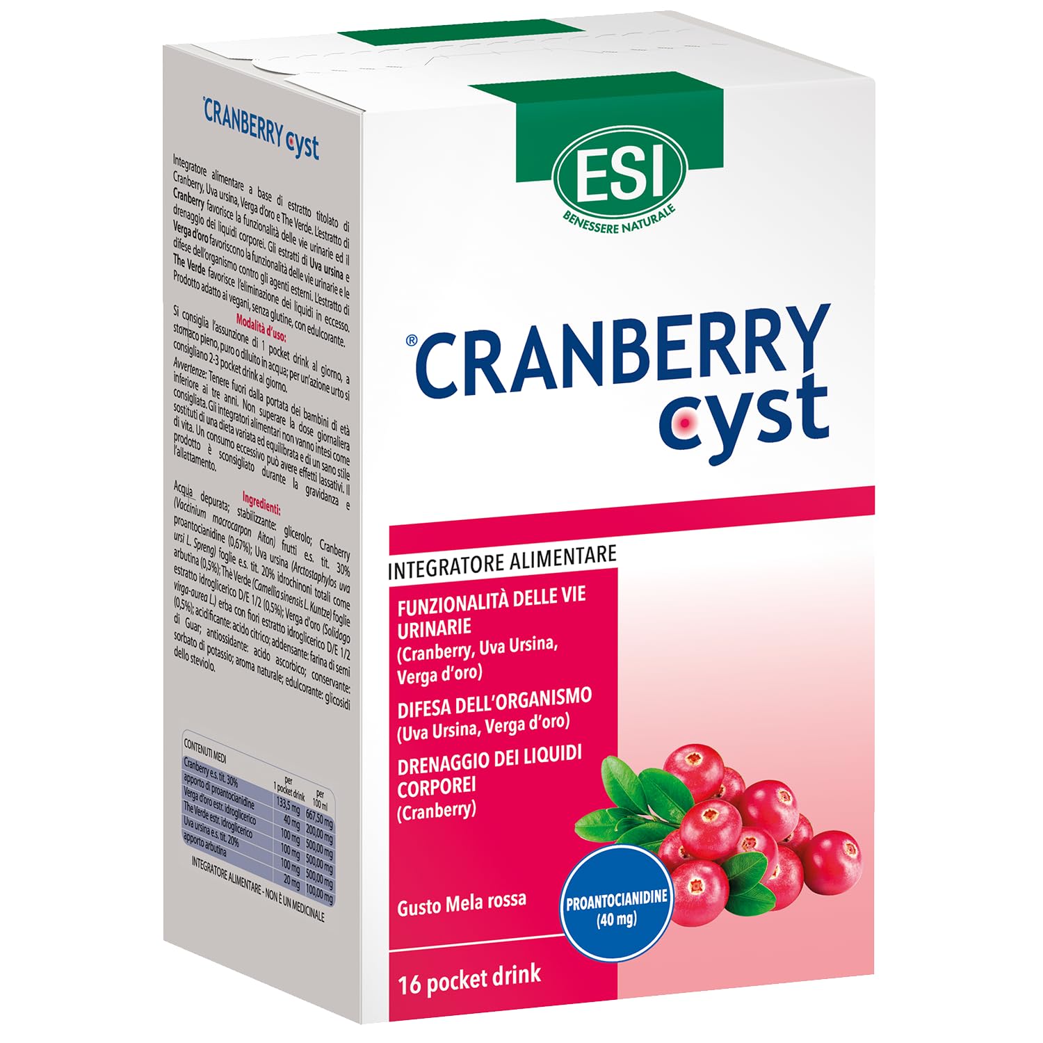 - ESI Cranberry Cyst: integratore alimentare a base di estratto titolato di cranberry, favorisce l'eliminazione dei liquidi in eccesso