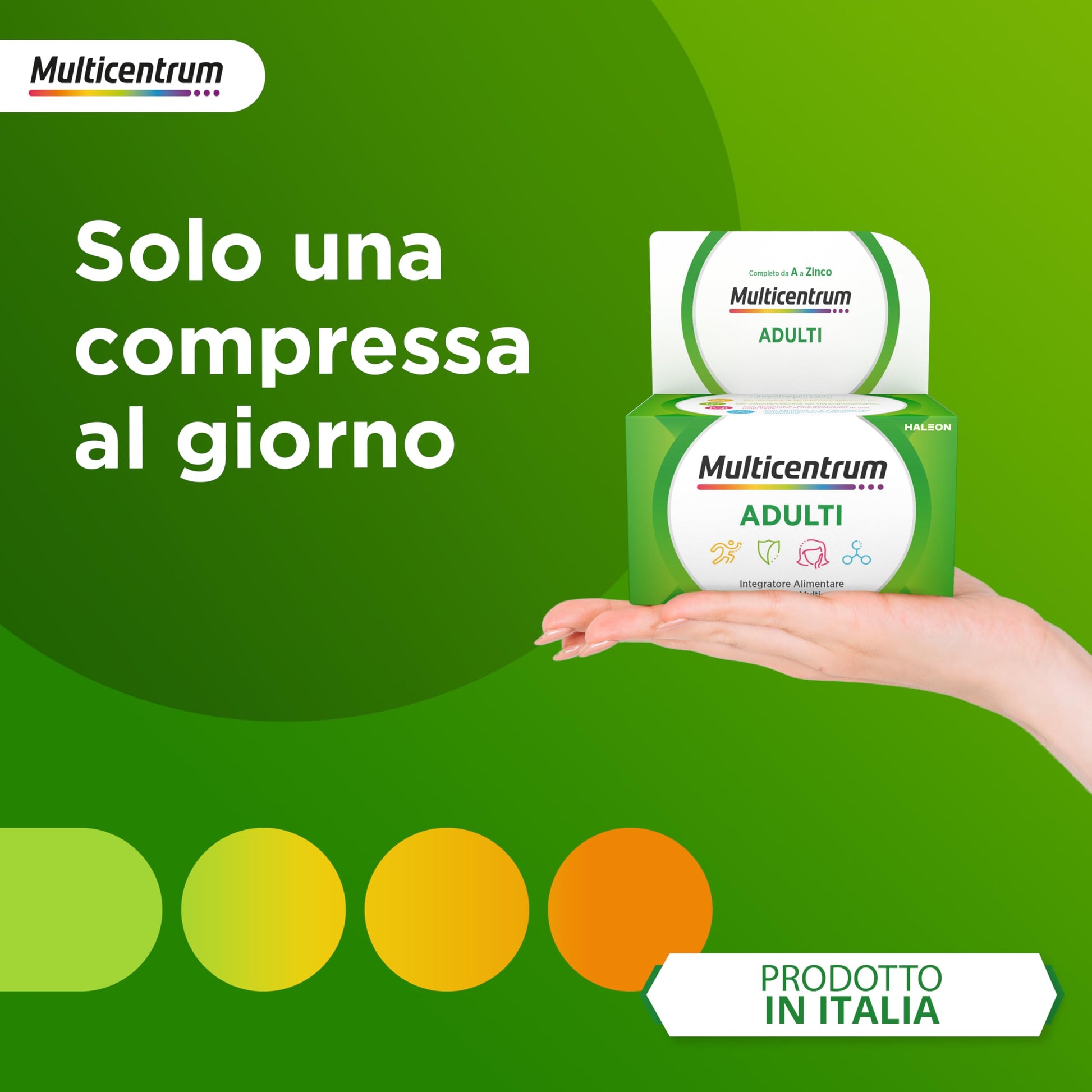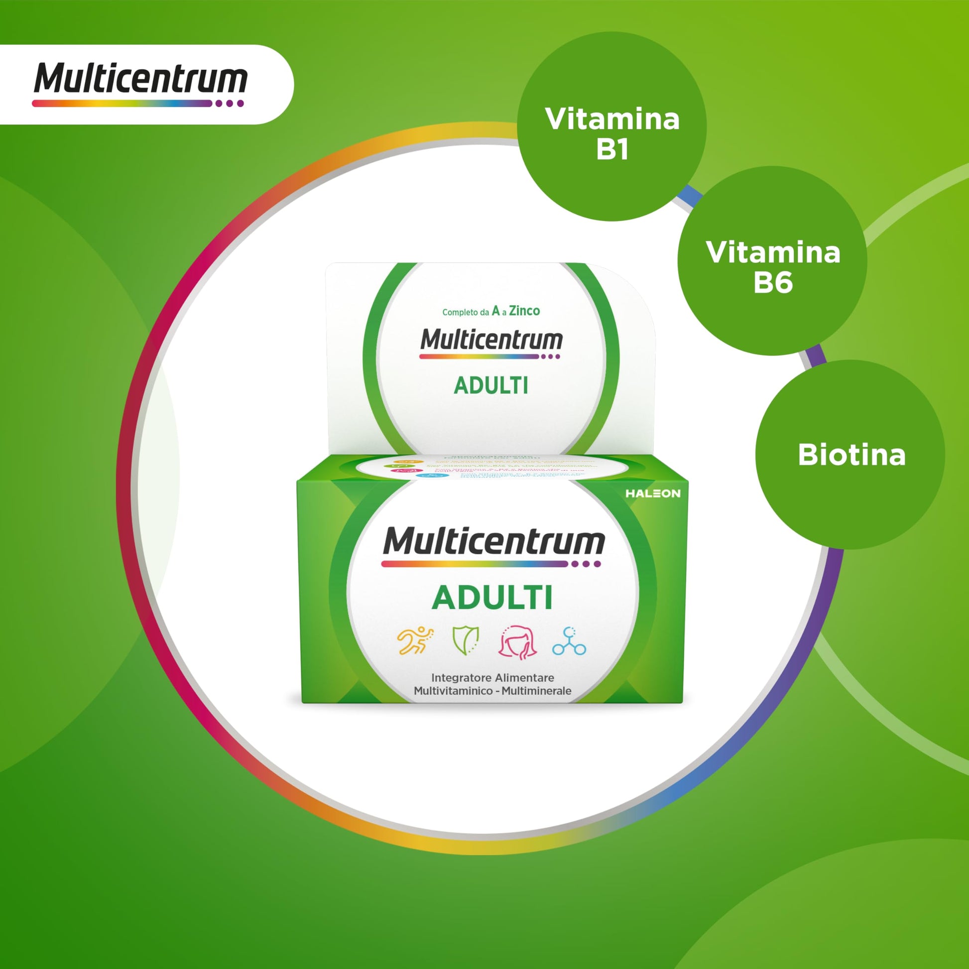 - APPORTO COMPLETO DI NUTRIENTI DALLA A ALLO ZINCO: Multicentrum Adulti multivitaminico contiene i nutrienti fondamentali per supportare le specifiche necessità degli adulti: con VITAMINA A, NIACINA E BIOTINA, che contribuiscono al mantenimento della pelle in salute; VITAMINE e MINERALI, per far fronte ai fattori stressanti provenienti dall'ambiente circostante, VITAMINA C, RAME E ZINCO, per supportare il normale funzionamento del sistema immunitario.