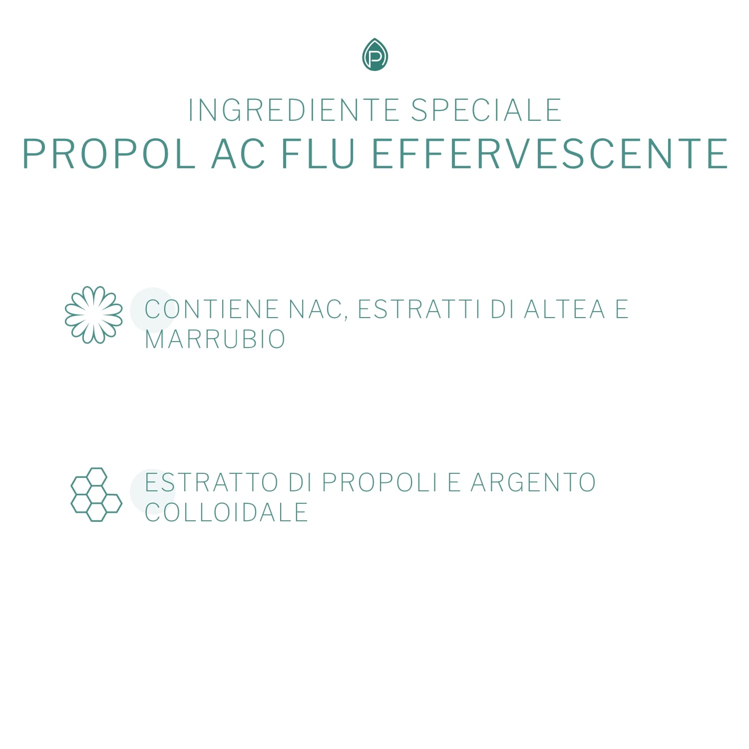 - PropolAC Flu Effervescente è un Dispositivo Medico per il trattamento degli stati irritativi della gola associati a tosse e secrezione di muco. Contiene NAC (N-acetilcisteina), fluidificante del muco che ne consente la fisiologica rimozione. Gli estratti di Altea e Marrubio favoriscono la formazione di una pellicola che protegge la mucosa del cavo orale dagli agenti irritativi esterni. L’estratto secco di Propoli e l’Argento colloidale preservano la preparazione.