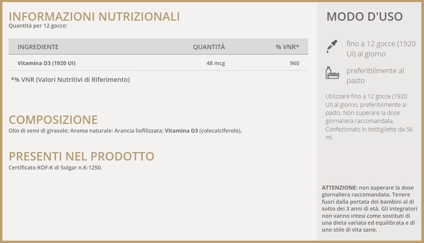 - Modalità d'uso: Si consiglia di utilizzare fino a 12 gocce (1920 UI di vitamina D3) al giorno, preferibilmente al pasto. Non superare la dose giornaliera raccomandata.